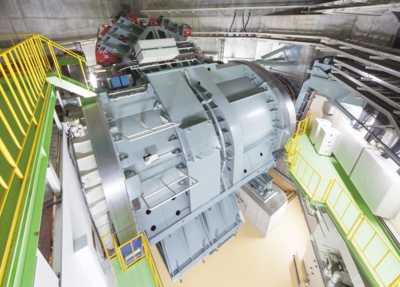 治療室の裏側にあり、重量200tを超える大型のガントリーである