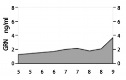 同月下旬、CTの検査を行うと、腫瘍は3つに分かれて縮小していた。その最大のものでも3㎝×2㎝にまで小さくなっていた(写真2参照)。さらに、リンパ球数とがん免疫力を表すGRN(リンパ球活動指標)は4近くまで上昇し、500個/μℓ(マイクロリットル)だったリンパ球数も1000個以上に増加した(図1・2参照)。