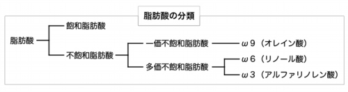 飽和脂肪酸と一価不飽和脂肪酸は体内でつくることのできる脂肪酸です。多価不飽和脂肪酸のω6とω3の脂肪酸は体内でつくることができないので、必須脂肪酸と呼ばれます。体内でつくられない必須脂肪酸は口から食べる必要があります。
